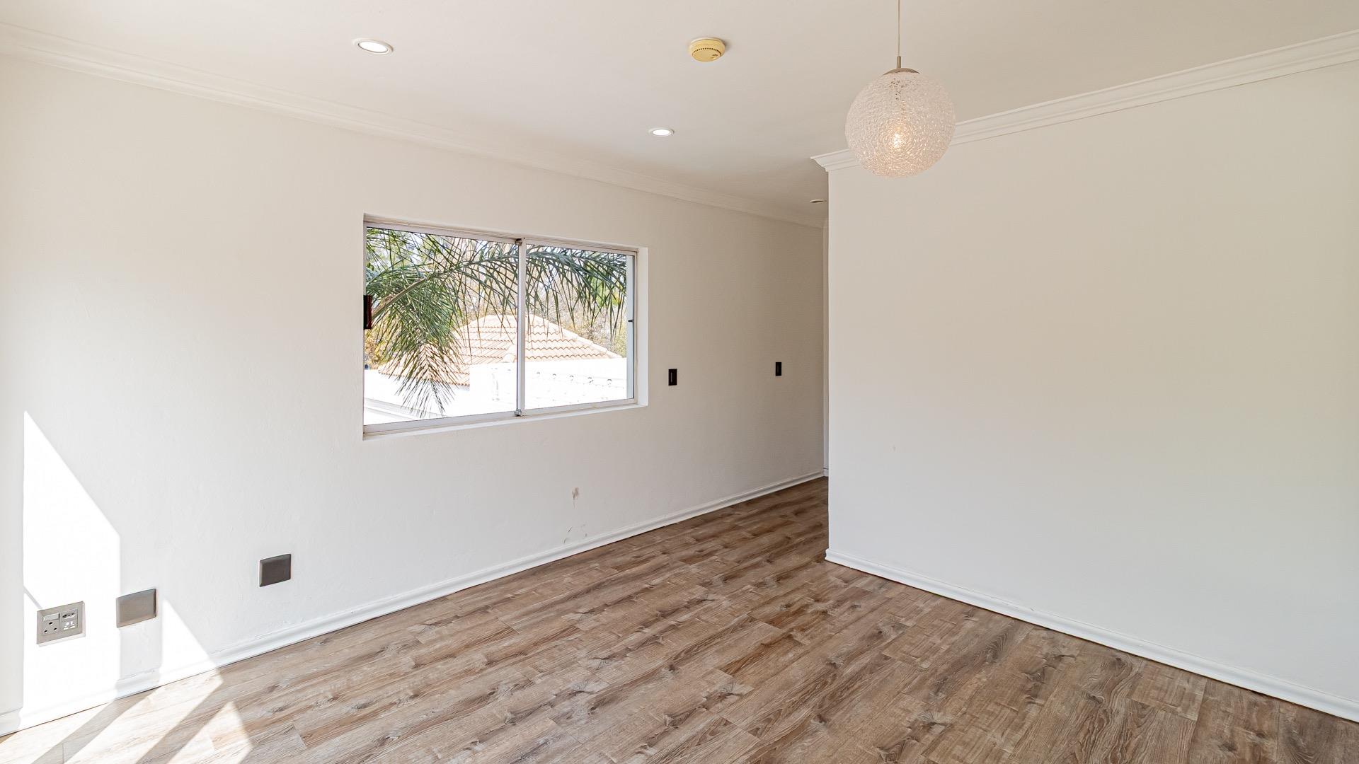 Upstairs, two bedrooms open onto their own private balconies and share a stylish bathroom. The main suite is a luxurious haven featuring its own private balcony, a spa bath, and ample cupboard space. All upstairs bedrooms are adorned with sleek laminated flooring, adding a modern touch.