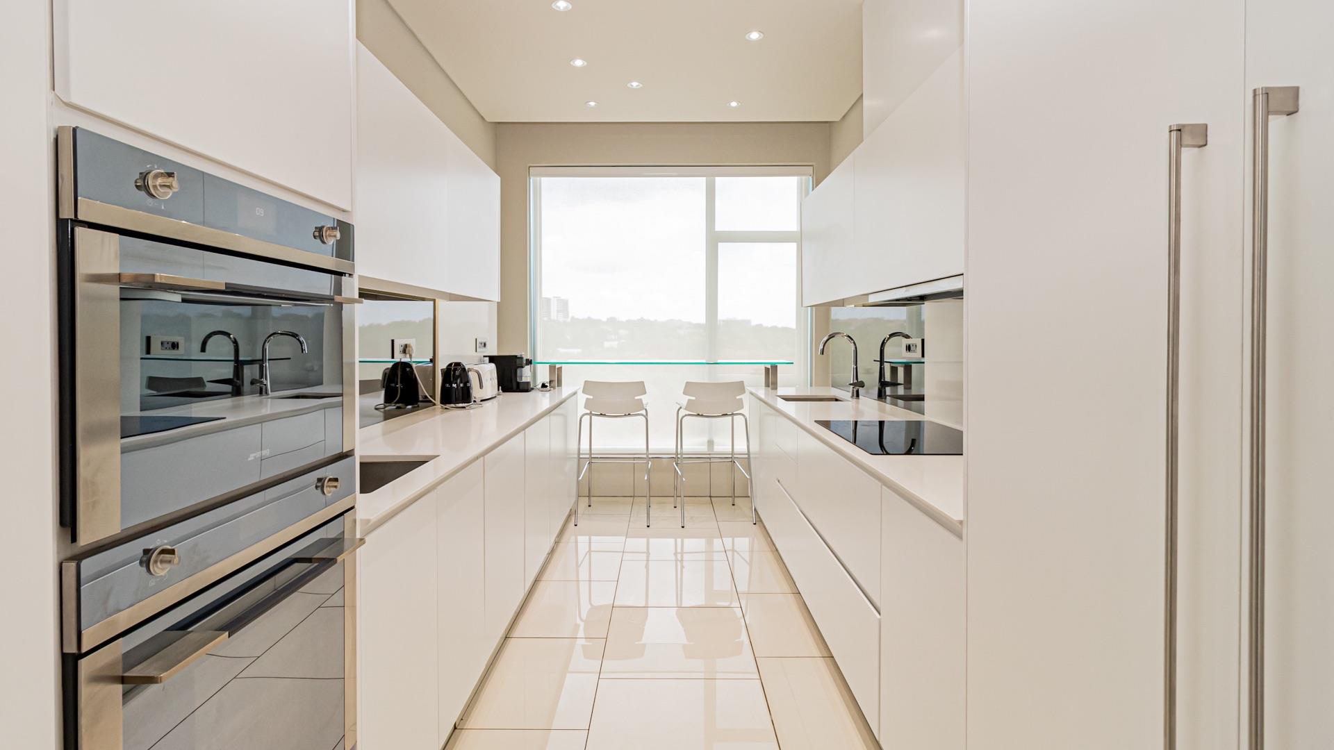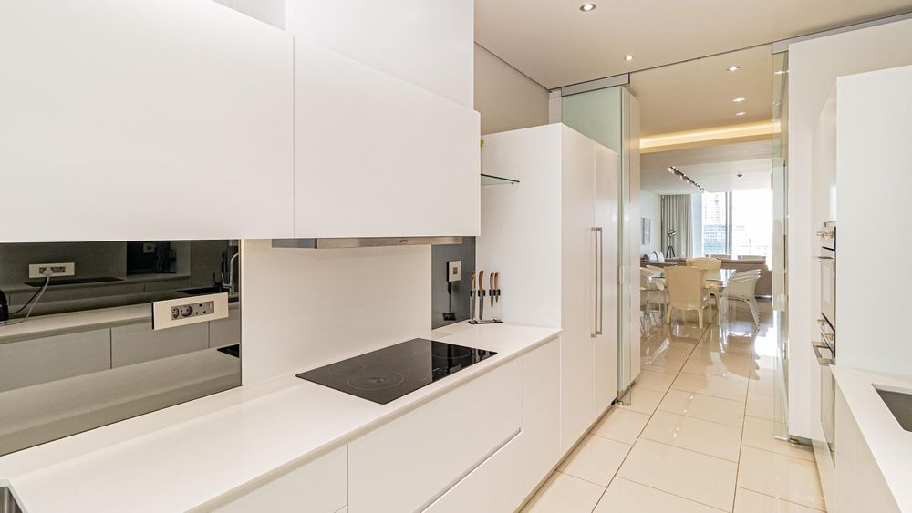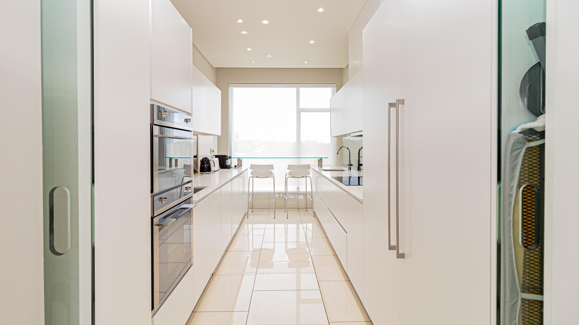 The apartment features a sleek kitchen equipped with all-white fitted Smeg appliances and pristine granite countertops. The open-plan dining and living area seamlessly flow onto a balcony, offering stunning views that create a perfect setting for relaxation and entertainment.